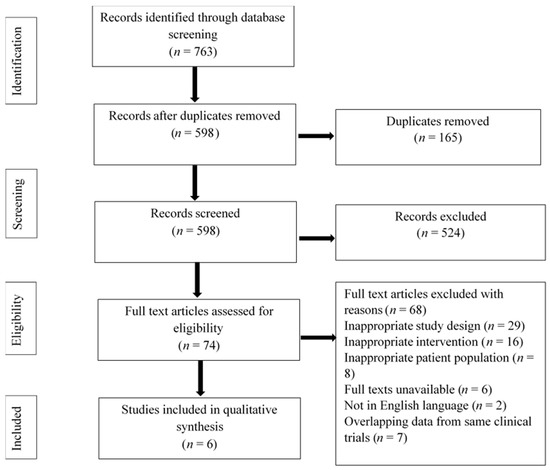 A total of 763 potentially eligible studies were retrieved from the initial database searches. After the removal of 165 duplicates, we screened the title and abstracts of 598 studies. Out of these, 524 articles were excluded due to the unavailability of full texts, and not related to our study objectives. The full texts of 74 studies were assessed, and 68 studies were excluded due to definite reasons (Figure 1). Finally, six studies were included in the qualitative analysis.