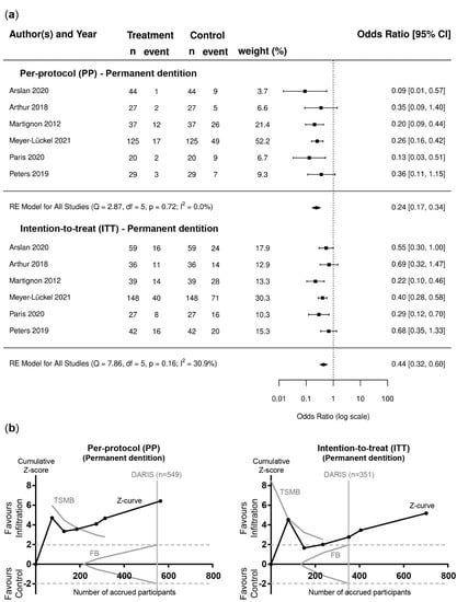 - Chatzimarkou, S.; Koletsi, D.; Kavvadia, K. The effect of resin infiltration on proximal caries lesions in primary and permanent teeth. A systematic review and meta-analysis of clinical trials. J. Dent. 2018, 77, 8–17. [Google Scholar] [CrossRef] [PubMed]