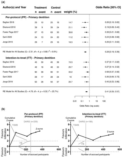 | Primary teeth | 581 per 1.000 | 279 per 1.000 (208 to 351) | 301 fewer per 1.000 (372 fewer to 230 fewer) | OR 0.28 (0.19 to 0.39) | 370 (5 RCTs) | ⨁⨁⨁⨁ High a,b |