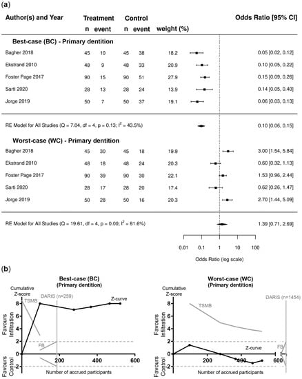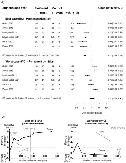 - Best-case (BC) and worst-case (WC) scenarios: In the best-case scenario all of the missing participants were assumed to have a favorable outcome in the resin infiltration group and a poor outcome in the control group, whereas the worst-case scenario assumes the converse. This approach is an imputation technique aiming to validate data reliability and robustness by providing an interval that includes all of the uncertainty related to the missing data [35,36].