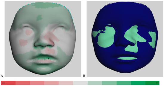(A) Color-coded distance map of the superimposed average faces from 9 to 12 months (T2 to T3), ranging from red (−5 mm) to green (5 mm). (B) Visualization of superimposed average faces showing only positive or negative values.
