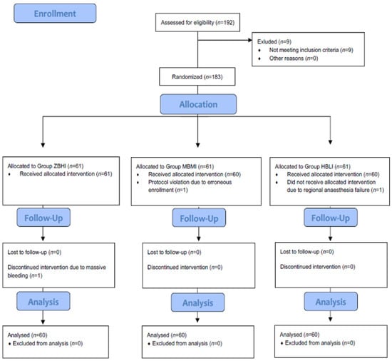 Consolidated Standards of Reporting Trials (CONSORT) chart showing patient recruitment and randomization. Group ZBHI–Group Zero Bolus High Infusion norepinephrine (NE) including 0 μg bolus dose plus 0.1 μg kg−1 min−1 infusion dose. Group HBLI—Group High Bolus Low Infusion NE including 10 μg bolus dose plus 0.05 μg kg−1 min−1 infusion dose. Group MBMI—Group Moderate Bolus Moderate Infusion NE including 5 μg bolus dose plus 0.075 μg kg−1 min−1 infusion dose.