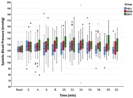 Systolic blood pressure trend. Group ZBHI—Group Zero Bolus High Infusion norepinephrine (NE) INCLUDION 0 μg bolus dose plus 0.1 μg kg−1 min−1 infusion dose. Group MBMI—Group Moderate Bolus Moderate Infusion NE including 5 μg bolus dose plus 0.075 μg kg−1 min−1 infusion dose. * represents high extreme SBP values in Group MBMI. Boxplot: line withing the box; median value, box top-bottom lines 25–75% top and bottom whiskers line; min-max value. Blue, red and green colored dots represent potential outliers.