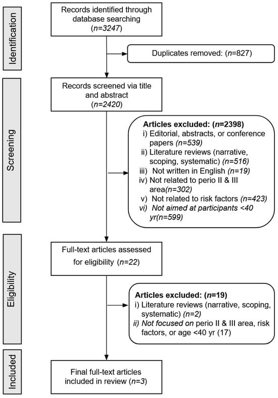 Using the criteria outlined in Table 1, the initial searches of the PubMed, WOS, and Cochrane databases yielded a total of 3247 articles. After removing duplicates, 2420 articles remained for screening. Another 2398 articles were excluded because they were either editorials, abstracts, or conference papers (539), literature reviews (516), not written in English (19), not related to periodontitis stages II and III (302), did not study risk factors (423), or did not study participants <40 years old (599). The remaining 22 studies were assessed in detail, resulting in 3 articles that met all the review criteria. Figure 1 provides an overview of the selection process.