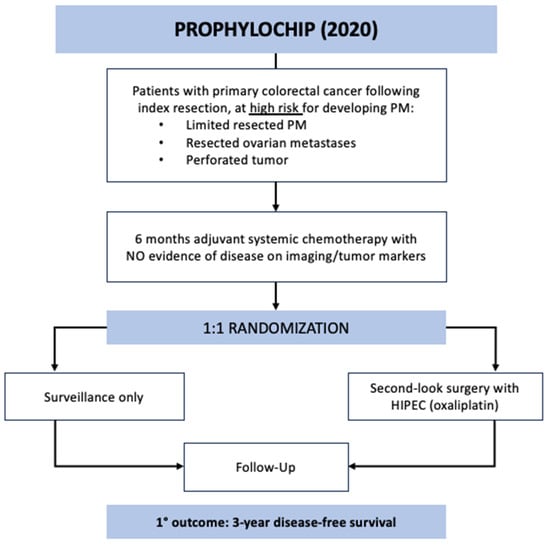 The PROPHYLOCHIP trial was a multicenter, phase 3 study that enrolled patients across 23 hospitals in France from June 2010 to March 2015 [18]. The study aim was to evaluate the potential survival benefit of systematic second-look surgery and HIPEC in patients with colorectal cancer at high risk of developing PM, which was defined as localized peritoneal disease resected at index operation, resected ovarian metastases, or perforated tumor. All patients underwent surgical resection of their primary tumor followed by 6 months of adjuvant systemic chemotherapy. If there was no evidence of recurrence at 6 months on imaging or tumor markers (n = 150), they were randomized 1:1 to the surveillance or treatment group (Figure 1). The treatment arm underwent second-look surgery that consisted of exploratory laparotomy followed by HIPEC administration with oxaliplatin for 30 min (IP oxaliplatin 460 mg/m2 alone or oxaliplatin 300–360 mg/m2 plus irinotecan 200 mg/m2 with concurrent IV 5-FU 400 mg/m2 and leucovorin 20 mg/m2). Over half of these patients were found to have macroscopic PM during second-look surgery and underwent CRS prior to HIPEC. All study patients were followed every 3 months with a physical exam, CT imaging, and tumor markers. The primary outcome of PROPHYLOCHIP was 3-year disease-free survival (DFS) or time from randomization to PM, distant recurrence, or death by any cause. There was no difference in the 3-year DFS between the treatment and surveillance groups (44% vs. 53%; HR 0.97, CI 0.61–1.56, p = 0.82). Moreover, no difference was detected in secondary outcomes, including 3-year peritoneal recurrence-free survival (59% treatment vs. 61% surveillance) and 5-year overall survival (OS) (68% treatment vs. 72% surveillance). Notably, the major postoperative complication rate (grade 3–4) after second-look surgery was high at 41% (29/71 patients), including 17% (12/71) with intra-abdominal complications, 67% (8/12) of whom required reoperation. Additionally, 43 patients in total developed recurrence amenable to surgery during the follow-up period, 35 of whom underwent repeat CRS with or without HIPEC.
