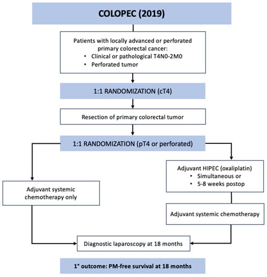 COLOPEC was a phase 3 RCT conducted across nine Dutch hospitals specializing in HIPEC between April 2015 and February 2017 [30]. The study aimed to evaluate the efficacy of adjuvant HIPEC with oxaliplatin after curative-intent resection in patients with locally advanced colorectal cancer. The included patients had T4N0-2M0 or perforated tumors without evidence of PM. A minority of the patients were randomized prior to primary tumor resection based on clinical T4 tumor (n = 30), and the majority were randomized after surgical resection following pathological confirmation of T4 or perforated tumor (n = 172) (Figure 2). The experimental arm underwent simultaneous or adjuvant HIPEC at 5–8 weeks after the index operation with the following regimen: IP oxaliplatin 460 mg/m2 for 30 min with concurrent IV 5-FU 400 mg/m2 and leucovorin 20 mg/m2 followed by 6 months of systemic chemotherapy. The control arm underwent systemic chemotherapy only. Overall, 87% of the study patients started chemotherapy at a median time of 6 weeks and 10 weeks after primary resection in the control and experimental groups, respectively. The primary endpoint was PM-free survival at 18 months, which was assessed with diagnostic laparoscopy in the patients with no imaging evidence of recurrent disease. No difference in PM-free survival was detected on intention-to-treat analysis between the groups at 18 months: 80.9% in the experimental vs. 76.2% in the control groups (one-sided log rank p = 0.28). Morbidity in the adjuvant HIPEC cohort was 14%, and the 18-month overall survival was similar between the groups at 93%. During the study period, 19 patients developed PM in the experimental arm: 9 at surgical exploration prior to HIPEC, 8 during routine follow up, and 2 during laparoscopy at 18 months. In the control arm, 23 patients developed PM: 16 during routine follow up and 7 during diagnostic laparoscopy. In the patients who developed PM, 13 of 19 (68%) in the experimental group and 15 of 23 (65%) in the control group were treated with CRS and HIPEC using mitomycin.