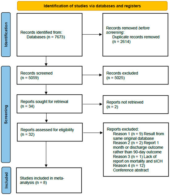 The initial literature search yielded 7673 entries. After 2614 duplicate entries were removed, the titles and abstracts of the remaining 5059 studies were screened. Among these, 5025 studies did not meet the inclusion criteria and were excluded. Of the remaining thirty-four studies, two did not have complete texts available, and the full texts of another thirty-two were assessed for eligibility. Of them, nine were excluded because they used data from the same registry; two were removed because they used the 1-month and discharge mRS score as an outcome measurement; and one was excluded because there was no reporting data on sICH or mortality. Additionally, 12 conference abstracts were excluded. Finally, eight studies (four RCTs and four non-RCTs) were included in the meta-analysis [11,12,13,14,15,16,17,18]. The study selection flowchart is presented in Figure 1.