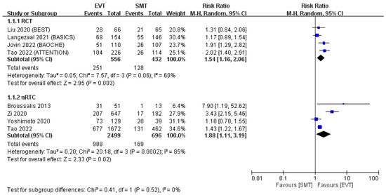 mRS score of 0–2 at 90 days. The forest plot demonstrated that the EVT group had a significantly higher incidence of mRS scores of 0–2 at 90 days in the pooled analysis of RCTs and a nonsignificantly higher incidence in the pooled analysis of non-RCTs [11,12,13,14,15,16,17,18].