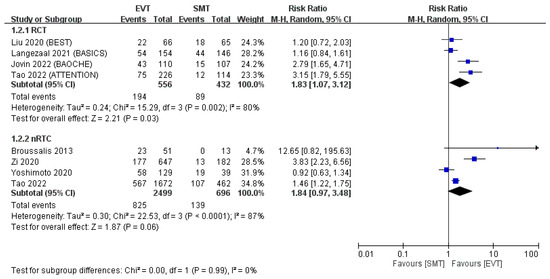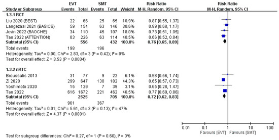 Mortality at 90 days. The 90-day mortality rate was significantly lower in the EVT group than in the SMT group in the pooled analysis of both RCTs and non-RCTs [11,12,13,14,15,16,17,18].