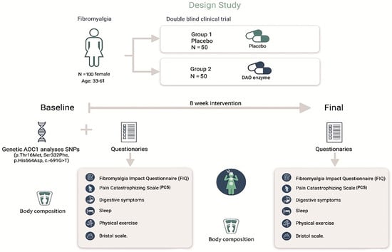 Age group between 30–61 years and medical diagnosis of FM were considered inclusion criteria. Exclusion criteria were multiple chemical sensitivities, following a low-histamine diet, treatment with DAO supplements, and some chronic diseases (cancer, AIDS, and Alzheimer’s disease).