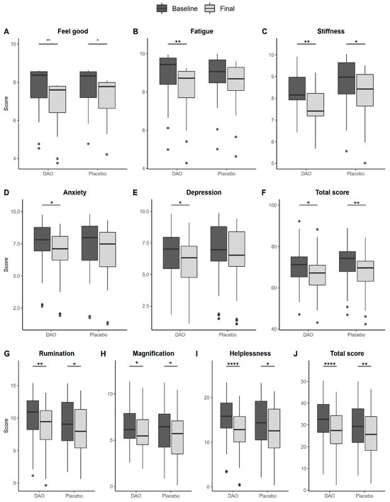 Predicted FIQ and PCS scores by study group according to time. (A): Changes in Feel good between subjects treated with DAO vs placebo pre- and post-intervention; (B): A: Changes in Fatigue between subjects treated with DAO vs placebo pre- and post-intervention; (C): Changes in Stiffness between subjects treated with DAO vs placebo pre- and post-intervention; (D): Changes in Anxiety between subjects treated with DAO vs placebo pre- and post-intervention; (E): Changes in Depression between subjects treated with DAO vs placebo pre- and post-intervention; (F): Changes in Total score between subjects treated with DAO vs placebo pre- and post-intervention; (G): Changes in Rumination between subjects treated with DAO vs placebo pre- and post-intervention; (H): Changes in Magnification between subjects treated with DAO vs placebo pre- and post-intervention; (I): Changes in Helplessness between subjects treated with DAO vs placebo pre- and post-intervention; (J): Changes in Total Score between subjects treated with DAO vs placebo pre- and post-intervention. The significance is presented after applying linear mixed models incorporating age, BMI, and centered scores for each response variable as covariates. * p < 0.05; ** p < 0.01; and **** p < 0.0001.
