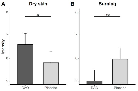 Intensity of clinical symptoms after treatment according to the study group. (A): Changes in Dry skin intensity between subjects treated with DAO vs placebo; (B): Changes in Burning intensity between subjects treated with DAO vs placebo. The estimated means and 95% confidence intervals are presented after applying a linear mixed model incorporating age, BMI, and centered scores of each response variable as covariates. * p < 0.05; ** p < 0.01.