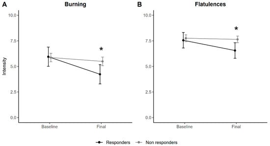 Estimated means for responders with a 20% improvement as assessed by the FIQ after eight weeks of treatment and non-responders according to the time. (A): Changes in Burning intensity between subjects treated with DAO vs placebo pre- and post-intervention; (B): Changes in Flatulences intensity between subjects treated with DAO vs placebo pre- and post-intervention. The estimated means and 95% confidence intervals are presented after applying linear mixed models incorporating age, BMI, and centered scores of each response variable as covariates. * p < 0.05.