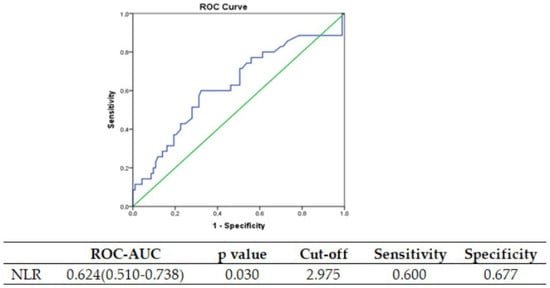NLR exhibited a noteworthy increase in the ruptured group. When considering the presence of rupture, the diagnostic performance of the NLR variable yielded a value of 0.624 (0.771–0.956) in terms of ROC-AUC, and an optimal cut-off value of 2.974 was identified (refer to Figure 2 for the ROC curve).