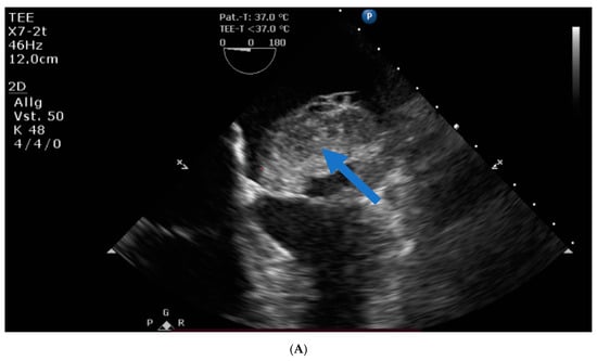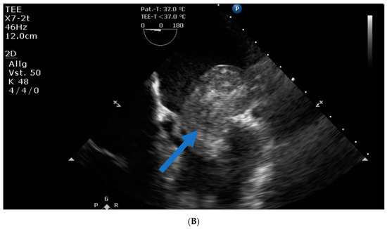 Transthoracic and transesophageal echocardiography revealed a large mass (40 × 60 × 24 mm) in the left atrial lateral wall, extending to the mitral valve (Figure 1A,B). Both atria were severely dilatated. The left ventricle was normal in size with an ejection fraction of 55%, an apicolateral/midlateral hypokinesia and a mild diastolic dysfunction. The normal-sized right ventricle had impaired systolic function. A hemodynamically irrelevant pericardial effusion was present.