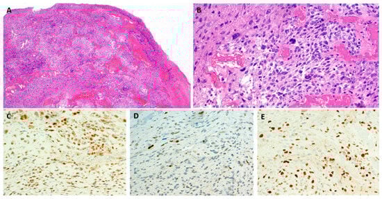 Pathologic gross examination revealed a fleshy soft exophytic and infiltrating mass, measuring 11.5 cm in aggregate. Histology showed an undifferentiated neoplasm composed of large spindled pleomorphic cells disposed into solid aggregates and loose fascicles within angiomyxoid stroma (Figure 3A,B). A brisk mitotic activity was noted with several atypical mitoses. The immunohistochemical staining revealed consistent expression of CDK4 (Figure 3C) and variable expression of MDM2 (Figure 3D) while other relevant markers tested negative (CD31, CD34, ERG, pankeratin AE1/AE3 and calretinin). KI67 highlighted >50% of the neoplastic cells (Figure 3E). Thus, the findings corresponded to an undifferentiated pleomorphic sarcoma with myxofibrosarcoma-like characteristics and CDK4 and MDM2 coexpression (so-called cardiac intimal sarcoma).