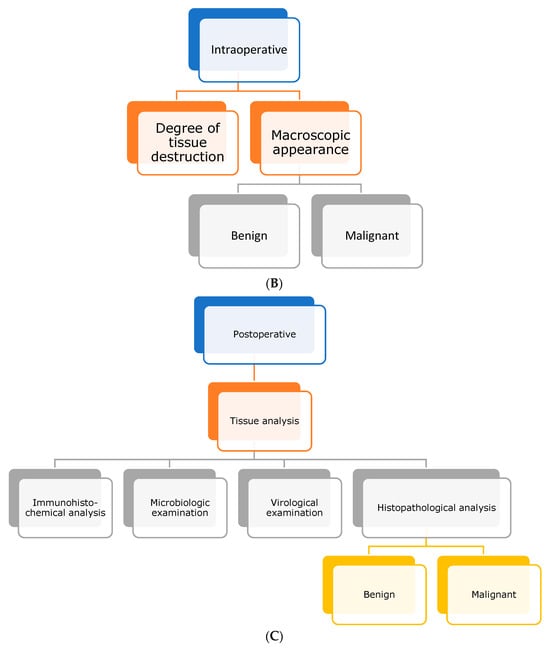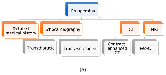 (A) Preoperative diagnostical steps of cardiac masses. (B) Intraoperative management of cardiac masses. (C) Postoperative diagnostic steps. (D) Postoperative treatment guide for cardiac masses.