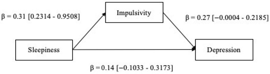 Results from the mediation analysis revealed that impulsivity fully mediates the association between daytime sleepiness and depression. One previous study [32] has demonstrated that impulsivity can mediate the association between sleep problems and depressive symptoms (e.g., suicide). The present work was focused on EDS, which is a well-known documented symptom of OSAS [57]. It was found that higher levels of daytime sleepiness were associated with higher impulsivity, which, in turn, can predict depressive symptoms. Previous research showed that sleepiness, among the different sleep problems, may lead to exaggerated behavioral reactivity to experiences [26]. Moreover, inadequate sleep is linked to poor impulse control [69], as a reflection of the interaction between sleep deprivation and the immature inhibitory brain circuitry [74]. A possible neurobiological explanation of this mechanism may involve inhibitory brain control.