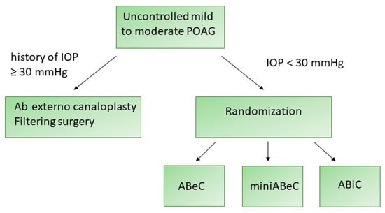 Despite being interesting, the results of this study should be treated as preliminary in their nature. The study has certain limitations, namely, a relatively small sample size and a short observation period. The scarce number of enrollees requires interpreting these results with great caution. In this trial, all modifications of C (ABeC, miniABeC, and ABiC) performed with phacoemulsification give a satisfactory lowering of pressure, a significant reduction in the number of medications, and an improvement of CDVA as well as VF stabilization without complications in Caucasians suffering from mild to moderate POAG. Two and three years postoperatively, no differences in median IOP reduction, achieved CDVA, or surgical success were noted. The only complication registered is PCO, which is rather a consequence of the phacoemulsification procedure and is easily removable. The content of this study is in line with previously published data on phacoC [17,18,19,20] and initial results of miniABeC [21]. This trial also adds to the state of the literature on ABiC. Three years after surgery, a few post-ABiC patients required reintroduction of topical treatment. Further research on a larger sample is needed to confirm this tendency. Perhaps ABiC would be more suitable for patients compliant to the usage of eye drops.
