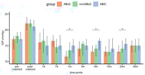 Distributions of intraocular pressure (medians and IQR, here and below) in all groups (ABeC, miniABeC, and ABiC) at each time point along with an estimate of the differences between the groups (notation of significance levels: *—p <0.050).