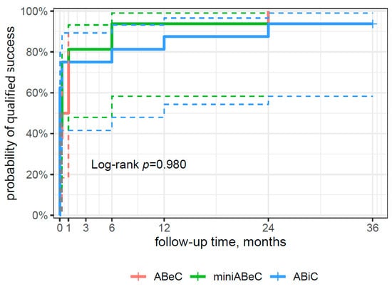 A plot of the Kaplan–Meier estimate of the survival function (risk type) of surgical success for patients undergoing ABeC, miniABeC, and ABiC with the log-rank test results (the solid lines of the appropriate color are the point value of 95% CI, and the dashed lines are the lower and upper limits of CI 95%).
