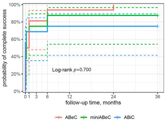 A plot of the Kaplan–Meier estimate of the survival function (risk type) of complete surgical success for the patients undergoing ABeC, miniABeC, and ABiC procedures with the log-rank test results (the solid lines of the appropriate color are the point value of 95% CI, and the dashed lines are the lower and upper limits of CI 95%).