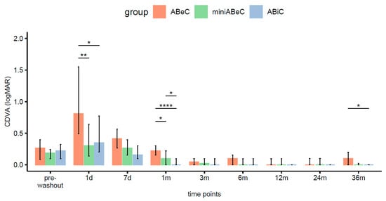 Distributions of CDVA (logMAR) in the ABeC, mini-ABeC, and ABiC groups at each time point along with an estimate of the differences between the groups (notation of the level of significant values: *—p < 0.050, **—p < 0.010, ****—p < 0.0001).