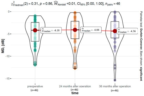 The analysis with the Kruskal–Wallis test showed that the MD parameter did not differ preoperatively between the ABiC (Mdn = −2.77 dB), C (Mdn = −4.68 dB), and MC groups (Mdn = −4.05 dB) (χ2 (2) = 3.24, p = 0.200, ϵ2 = 0.07). Two years postoperatively, the values of the MD parameter also did not differ between various surgeries (χ2 (2) = 5.64, p = 0.060, ϵ2 = 0.12). Similarly, no differences occurred 36 months postoperatively between the groups (χ2 (2) = 2.87, p = 0.240, ϵ2 = 0.24). Over time, namely, between the preoperative time point (Mdn = −4.18 dB), 24 months after operation (Mdn = −4.08 dB), and 36 months after operation (Mdn = −4.36 dB), there were no significant differences within the MD (Friedman ANOVA, χ2 (2) = 0.31, p = 0.860, < 0.01). A graphical visualization of the variable’s distribution along with the reporting of the results is presented in Figure 7.