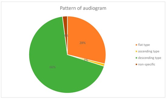 On comparison of the types of audiograms in the HZO w HL group, the descending type was the most frequent (33, 66.0%), followed by the flat type (14, 28.0%), and the non-specific type (2, 4%). The ascending type was the least common (1, 2.0%) (Figure 1).