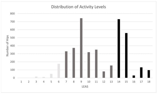 Distribution of the activity levels according to LEAS score 2 years after THA implantation. Low activity was defined as LEAS 1–6 (light grey), moderate activity as LEAS 7–13 (dark grey), and high activity as LEAS 14–18 (black).