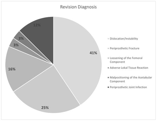 Predicted revision-free survival was 99.7% at 2 years, 98.8% at 5 years, and 97.3% at 7 years. A total of 32 hips (0.8%) underwent revision surgery with component exchange. The mean time from implantation to revision was 26 months (range 0–67 months, SD 22 months). Indications for revision are shown in Figure 2. The most common diagnosis was dislocation/instability (13), followed by periprosthetic fracture (8), loosening of the femoral component (5), periprosthetic joint infection (PJI, 4), adverse local tissue reaction (ALTR, 1), and malpositioning of the acetabular component (1). The mean time to revision in the low-activity groups was 20.1 months (range 0–50, SD 18.2), in the moderate-activity group 30.6 months (range 0–67, SD 23.0), and in the high-activity group 21.6 months (range 0–64, SD 21.9).