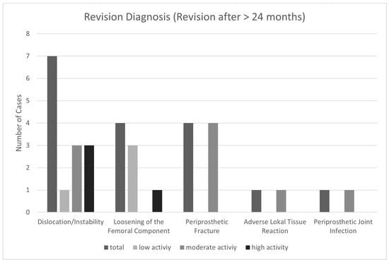 A total of 15 of the 32 revision cases underwent revision within 2 years following primary implantation and were therefore excluded from the correlations between activity levels (assessed at 2 years) and revisions. The indications for revision after 24 months and the distribution based on the activity groups is presented in Figure 3.