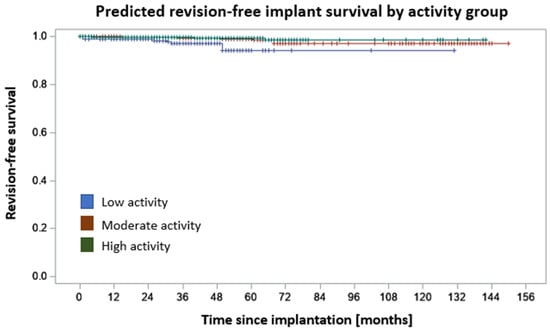 Kaplan–Meier curve on predicted revision-free survival grouped by activity level. For details on survival rates and comparison of the groups, please see the main manuscript.