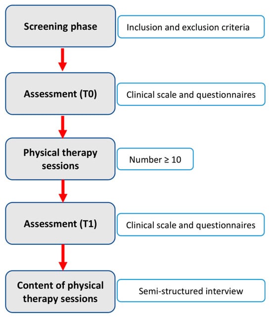All participants underwent the PT sessions foreseen by the NHS and were clinically assessed before (T0) and after (T1) (Figure 1). No follow-up evaluation was performed. All the clinical evaluations were performed by an experienced clinical researcher not involved in the PT sessions.