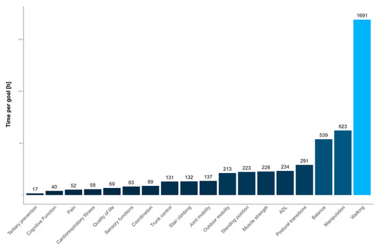 A total of 3164 h of PT were dedicated to PwST (Figure S2). The most selected goal was “walking” with 1106 h (35%), followed by “manipulation” with 416 h (13.1%) and “balance” with 398 h (12.6%), while the least selected goals were “joint mobility”, “cardiorespiratory fitness”, “cognitive function”, and “QoL”.