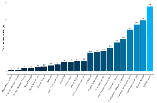 The PT intervention most frequently proposed in the whole sample was “walking training” with 755 h (15.8%), followed by “balance training” with 593 h (12.4%). Figure 3 shows the number of hours dedicated to each PT intervention in PwND.