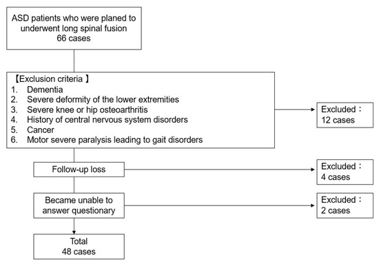 Forty-eight patients, 4 males and 44 females, were included by exclusion criteria in 66 consecutive patients who underwent corrective surgery as a treatment for ASD at our institution from June 2017 to February 2022 (Figure 1). The inclusion criteria were age over 50 years or older and who showed radiographical evidence of at least one of the following: sagittal vertical axis (SVA) of 95 mm or more, pelvic tilt (PT) of 30 degrees or greater, and/or coronal Cobb angle of 30 degrees or greater [14]. Exclusion criteria were dementia, severe deformity of the lower extremities, severe knee or hip osteoarthritis, history of central nervous system disorders, cancer, and motor severe paralysis leading to gait disorders.