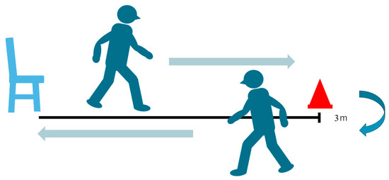 The timed up-and-go test (TUG) is used to assess mobility and dynamic balance [18] (Figure 3). The examiner uses a stopwatch to measure the time. Patients wear their regular footwear and can use a walking aid if needed. Begin by having the patient sit back in a standard armchair and identify a line 3 m or 10 feet away, on the floor. First, the examiner instructs the patient when I say “Go”, I want you to stand up from the chair, walk to the line on the floor at your normal pace, then turn, walk back to the chair at your normal pace, and finally sit down again. The examiner should always stay by the patient for safety.