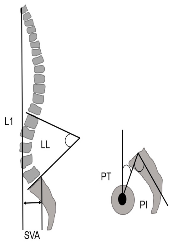 Spinopelvic parameter, SVA; sagittal vertical axis, LL; lumbar lordosis, PT; pelvic tilt, PI; pelvic incidence (cited from [10]).
