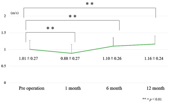 The 10 m walk velocity of pre-operation and post-operation (one year) were 1.0 ± 0.3 m/s and 1.2 ± 0.2 m/s, respectively (p < 0.01). The TUG of pre-operation and post-operation were 12.1 ± 3.7 s and 9.7 ± 2.2 s, respectively (p < 0.01). The ODI was improved from 38.6 ± 12.8% to 24.2 ± 15.9% after surgery (p < 0.01). Each effect sizes were 0.63, 0.78, and 1.0 (Table 3).