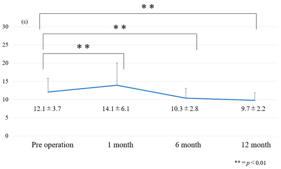 The word “Go” is the beginning timing, and then the examiner stops timing after the patient sits back down and records the time. In this study, the patient asked for this test twice and the better time was adopted. An older adult who takes ≥12 s to complete the TUG is at risk for falling. The average values are 60–69 years old; 7.9 ± 0.9 s, 70–79 years old; and 7.7 ± 2.3 s [19]. For healthy adults, the TUG has demonstrated excellent interrater reliability (ICC = 0.99) [20] and intra-rater reliability (ICC = 0.99) [21] in healthy older adults.