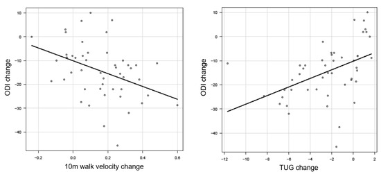 External responders of 10 m walk velocity and the TUG were referenced in Table 4 and Table 5. There was a significant correlation between 10 m walk velocity and ODI (r = −0.41, p < 0.01) (Figure 8). We recognized a meaningful correlation between the TUG and ODI (r = 0.57, p < 0.01) (Figure 9).
