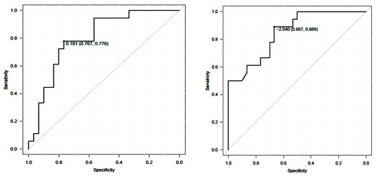 The ROC analysis prevailed cutoff value of 10 m walk velocity was 0.10 m/s. The AUC was 0.8% and the 95% CI was 0.67~0.93 (sensitivity 0.78, specificity 0.77) (Figure 8). A cutoff value of TUG was −2.04 s. The AUC was 0.85%, and the 95% CI was 0.74~0.96 (sensitivity 0.67, specificity 0.85) (Figure 9).