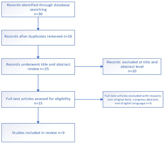 The screening process is summarized in a flow chart (Figure 1). During screening, 30 articles were identified. Fourteen studies were excluded by type of publication. Finally, after exclusion, nine articles were included at the end of the selection process.