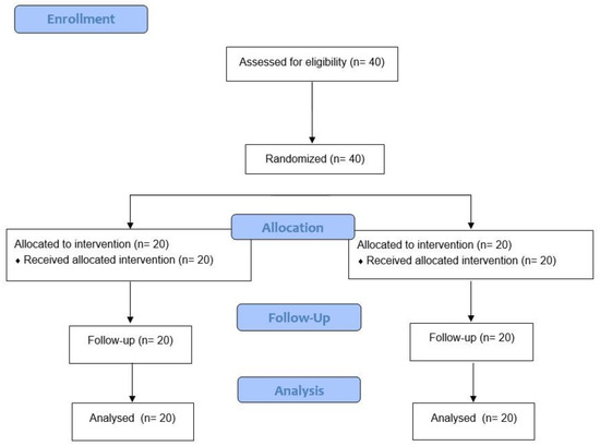 Given the lack of studies that allow us to calculate the sample size for the sample to be representative, a pilot study will be carried out to obtain these data. A total of 40 subjects (20 men and 20 women) will be evaluated, divided into a control group (n = 20) and an experimental group (n = 20) (Figure 1).