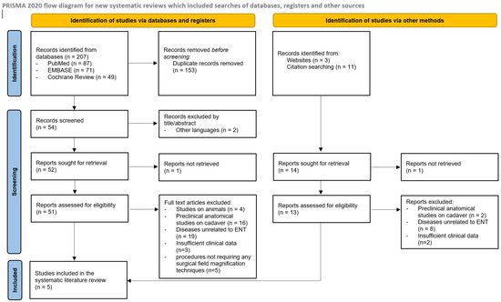 The PRISMA flow diagram is shown in Figure 1. After duplicate removal, 54 potentially relevant records were identified through database searching and other sources. To note, two studies were excluded after title and abstract review and one was not retrieved, while the full text of the remaining fifty-one articles were examined for further review. Finally, five studies were screened for eligibility and included in this systematic review [17,18,19,20,21]. A total of 182 patients were described in the selected studies, as summarized in Table 1. However, all studies were focused on analyzing advantages and disadvantages of the new surgical technique and therefore some clinical data were not available (sex, follow-up). The mean age was between 68 months and 8 years. The surgical procedures belong to the otologic field, head and neck surgery, and transoral surgery.