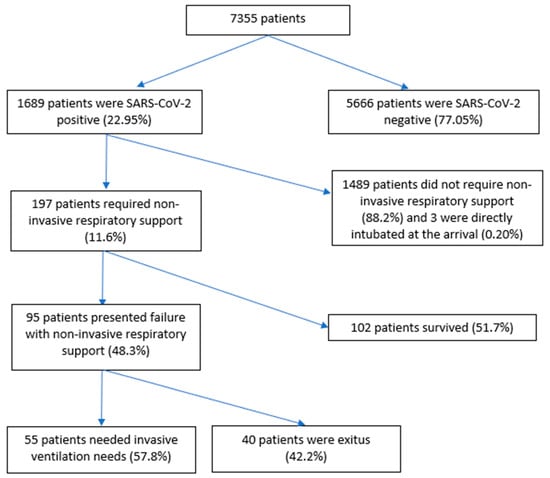 Of 7355 patients, 197 (11.6%) were included. Among the exclusions, 5666 (77%) patients were excluded because they were SARS-CoV-2-negative, 3 because of early orotracheal intubation (0.2%), and 1489 were SARS-CoV-2-positive patients (88%) who did not require NIRS. Of the 197 patients who required NIRS, 95 of them failed this therapy (48.3%) (Figure 1).