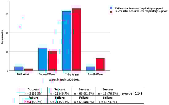 If we assess the place of onset of the NIRS, we find that its onset in the conventional hospitalization ward (61%), in all its modalities, is more frequent with respect to the hospital emergency service (39%). This may be due to the syndrome of “happy hypoxemia” or a few advanced conditions upon arrival at the emergency room, which would cause the need for no initiation of NIRS. Thus, the greater failure of NIRS in emergency services (57.9%) could be caused by more severe conditions or more advanced disease and, therefore, by the later initiation of therapy, which requires the immediate initiation of NIRS. The fact that there is less failure of the NIRS in the conventional hospitalization ward indicates that it is possible to perform NIRS safely and effectively, mainly by providing adequate monitoring and training of health personnel. In this sense, it is important to highlight that at the end of the second wave, all patients with respiratory support were in the same conventional hospitalization ward, which included centralized monitoring and medical and nursing staff with more experience. It is difficult to measure the impact of these actions; however, from the third wave onwards, a greater number of successes than global failures was observed.