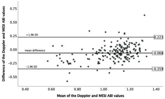 The Bland–Altman plot (Figure 1) displays a mean difference of -0.068 between the Doppler and MESI ABI measurements, with the limits of agreement of 0.223 and −0.359. The linear regression analysis indicated the presence of proportional bias (R2 = 0.149, F(1,202) = 35.238, p < 0.001).