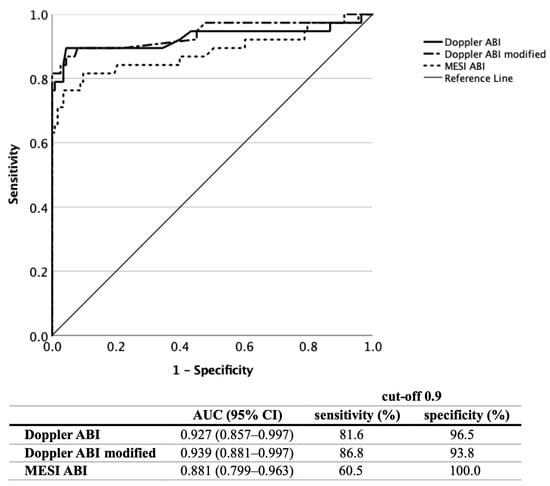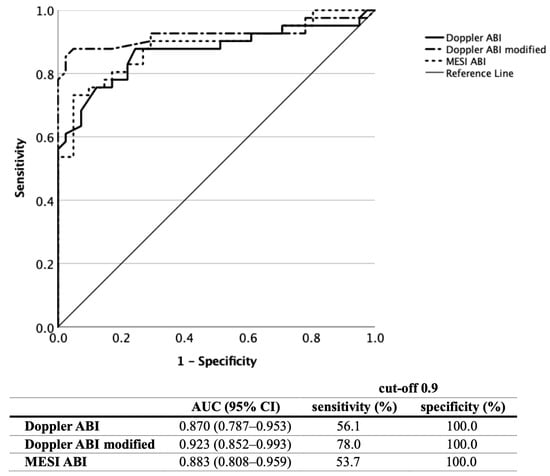 For the cut-off value of 0.9 ABI, the Doppler ABI [AUC = 0.888, (95% CI 0.832–0.943), p < 0.001] showed a sensitivity/specificity of 67.1%/97.4%, the modified Doppler ABI [AUC = 0.925, (95%CI 0.878–0.972), p < 0.001] showed 82.3%/95.5%, and the MESI ABI [AUC = 0.891, (95% CI 0.839–0.942)] showed 57.0%/100%.